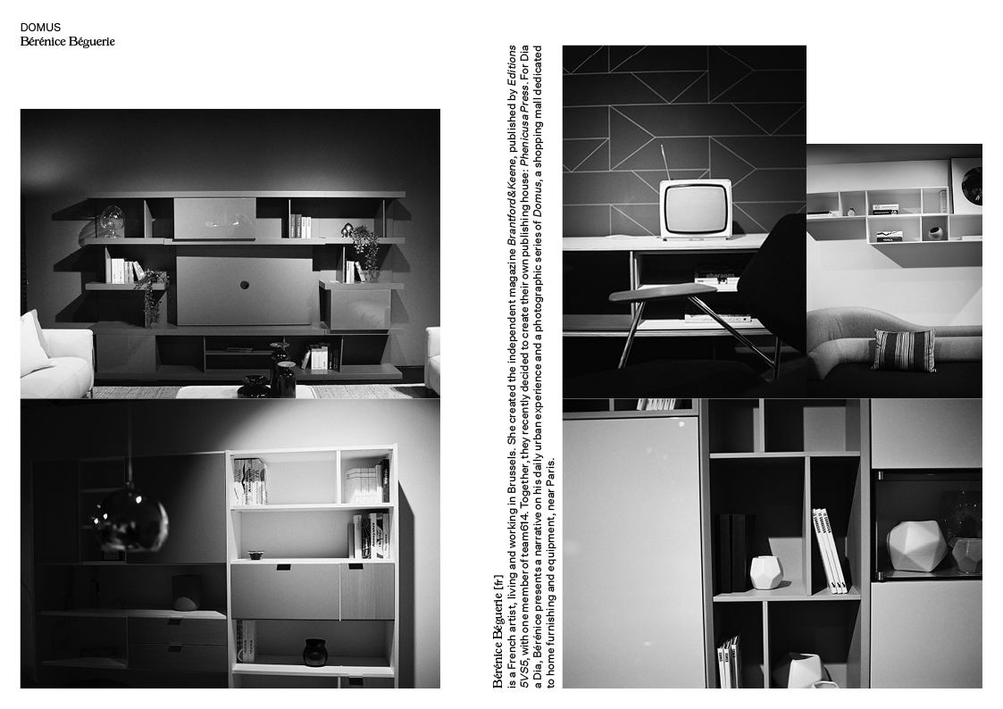 Bérénice Béguerie is a French artist, living and working in Brussels. She created the independent magazine Brantford&Keene, published by Editions 5VS5, with Fabien Goutelle. Together, they recently decided to create their own publishing house: Phenicusa Press. For Dia a Dia, Bérénice presents a narrative on his daily urban experience and a photographic series of Domus, a shopping mall dedicated to home furnishing and equipment, near Paris.